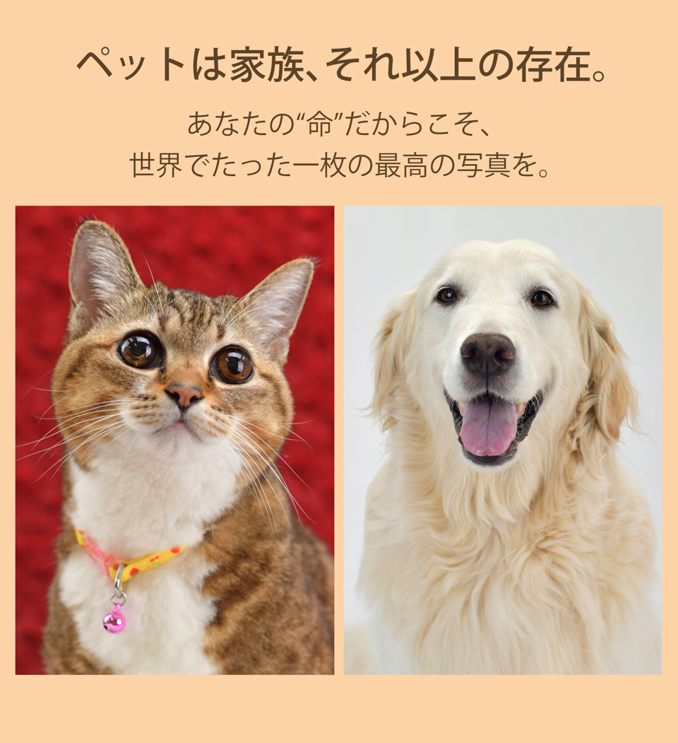 | 「自分のスマホで撮っているとペットの写真ばかりで自分と一緒の写真がない…」、そんな飼い主さんはこの機会にぜひ! 当館なら一生の想い出に残る特別な家族写真が撮影できます。 |